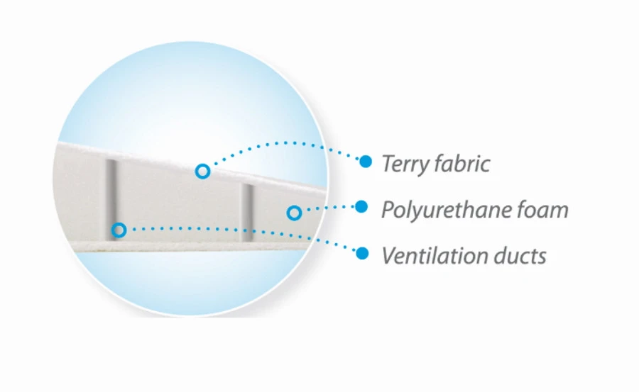 Dit handige kussen heeft verticale ventilatiekanaaltjes die zweten helpen voorkomen. De vulling van het kussen bestaat uit comfortabel PU schuim. Het tijk van het kussen is gemaakt van badstof (katoen en polyester) en kan worden verwijderd om het te wassen. De afmetingen van het kussen zijn 60 x 36 cm.