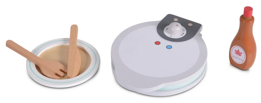 De set bestaat uit een wafelijzer met draaiknoppen, een wafel, bordje, bestek en maple siroop. De wafel kan je in vieren delen en er zitten aardbeien op. Dat wordt smullen!