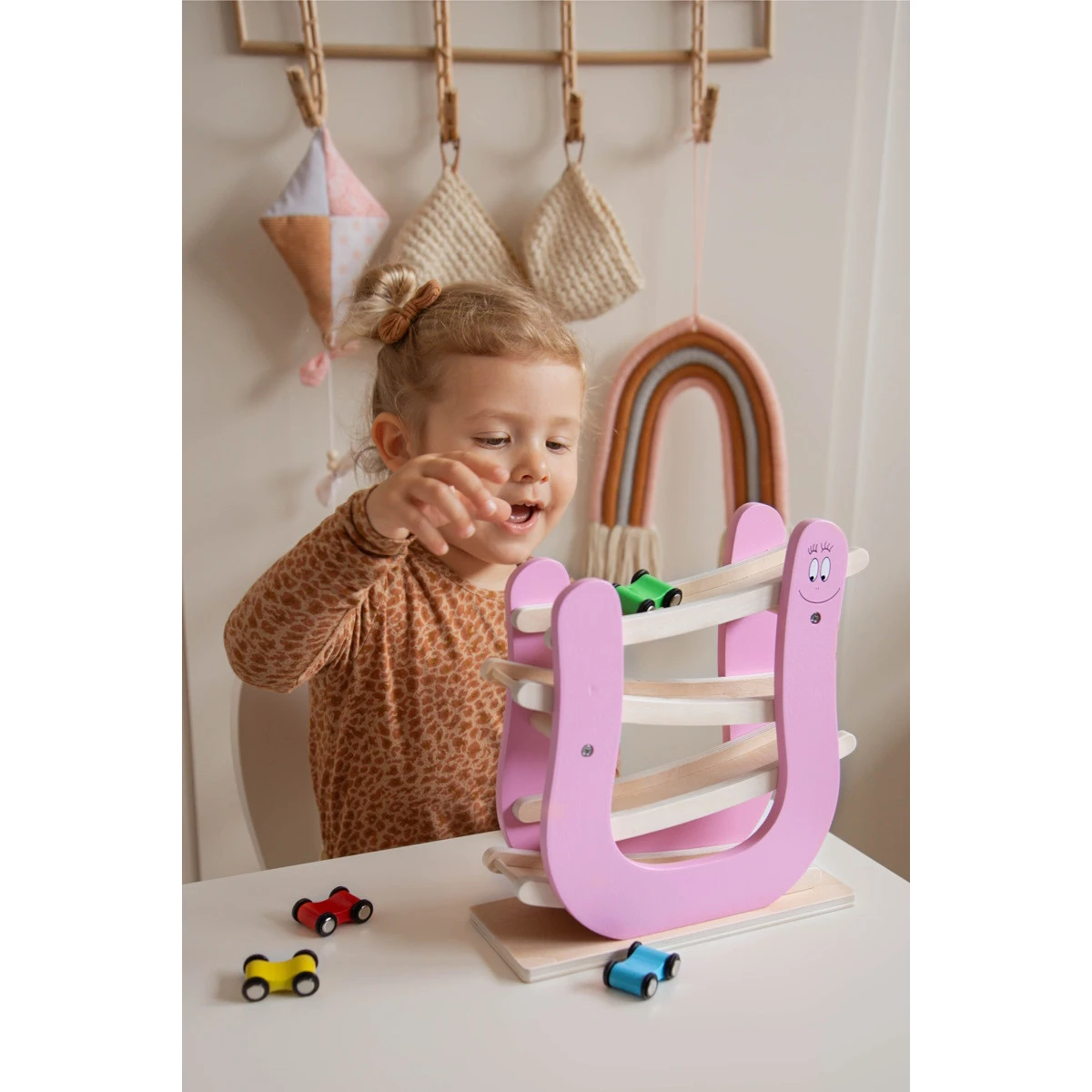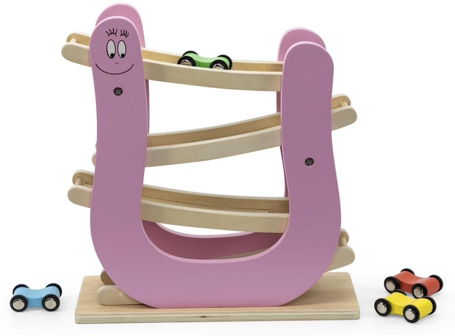 Je kleine zal urenlang speelplezier beleven met deze Label Label houten autobaan met Barbapapa thema! Zet de autootjes één voor één bovenin de autobaan en laat ze naar beneden racen! Er worden 4 autootjes meegeleverd, zo kan je kleine goed in de gaten houden welke als eerst beneden is.