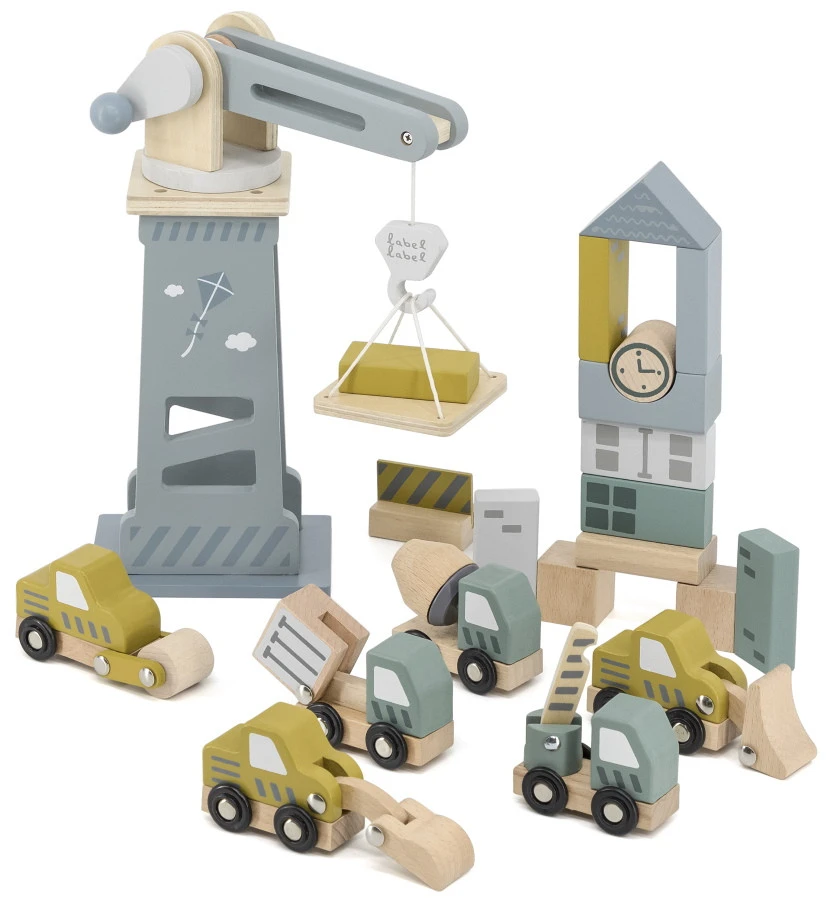 Je kleine zal zich uren kunnen vermaken met deze stoere, houten bouwplaats van Label Label! Deze complete set bestaat uit een hijskraan, betonmolen, graafmachine, bulldozer, vrachtwagen, cement truck, een slagboom en verschillende blokken.