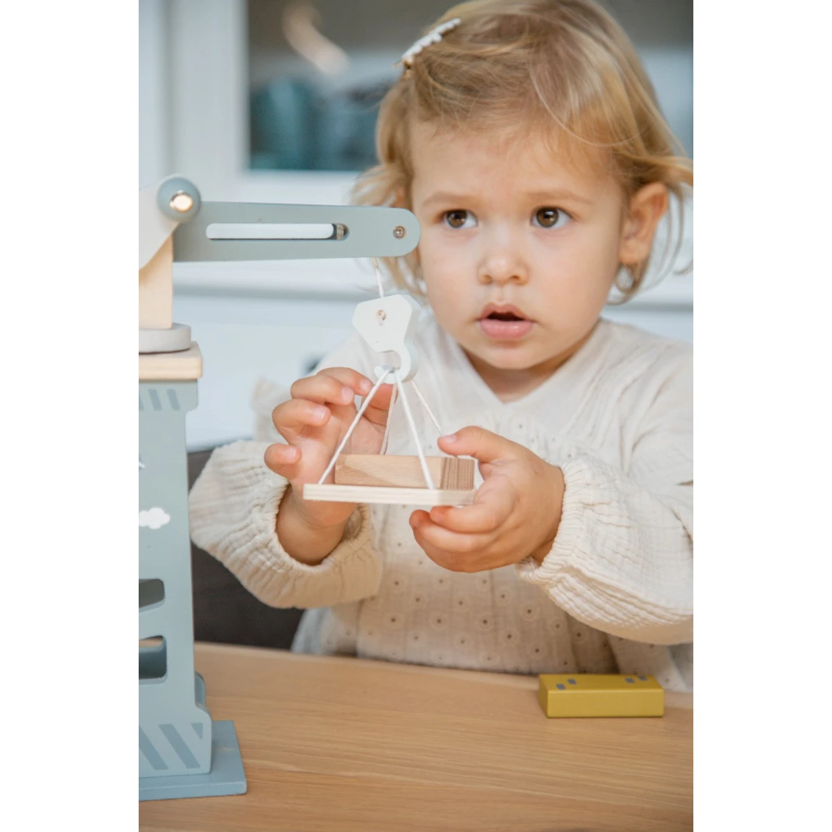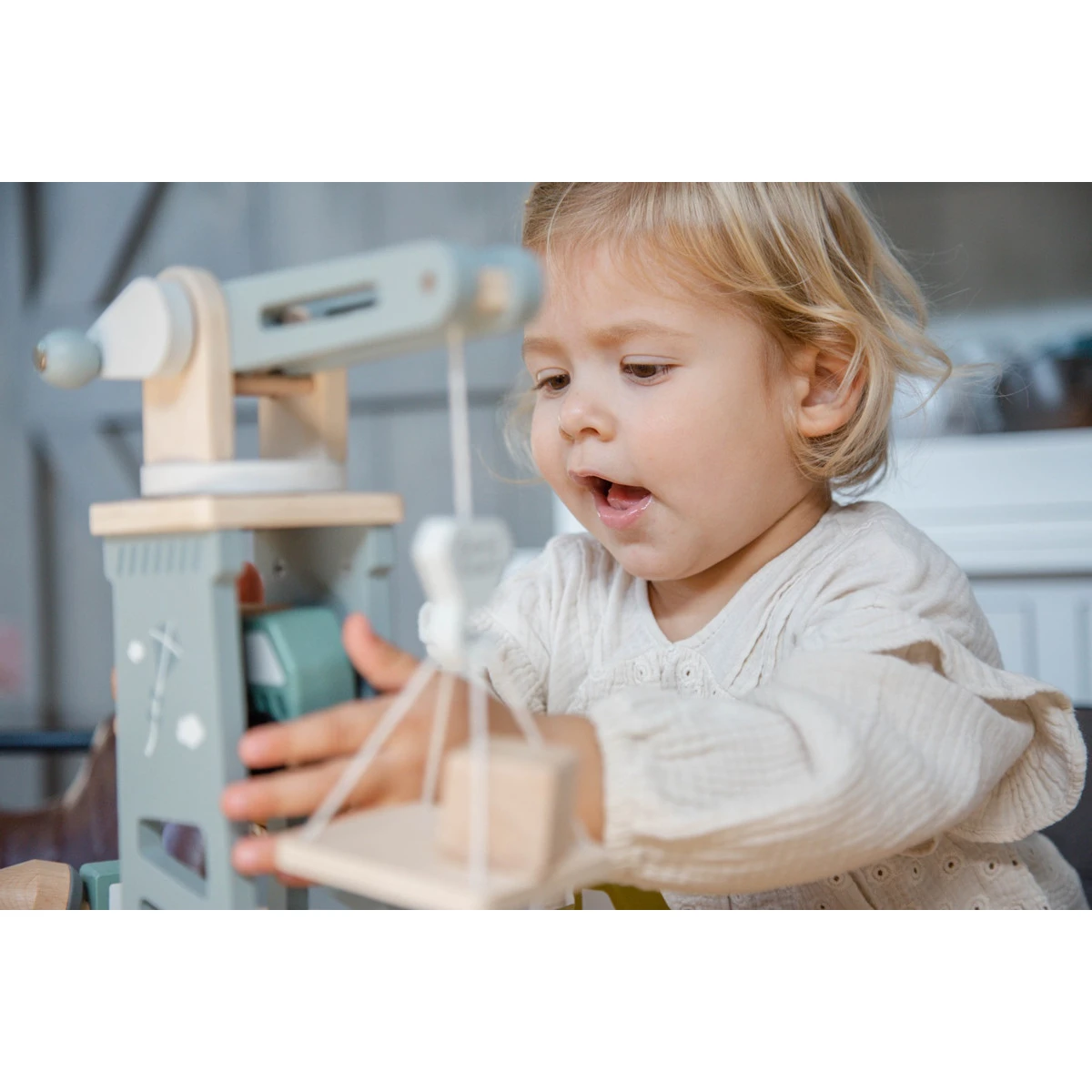 Hiermee kan je kindje de mooiste gebouwen maken! Als je aan de knop van de hijskraan draait zal deze het doen en kan je kindje spulletjes naar boven takelen. De bouwplaats is gemaakt van FSC hout en geschikt voor kindjes vanaf 3 jaar.