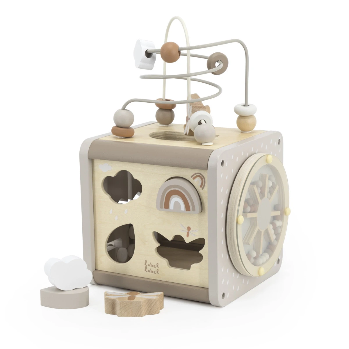 Een vormenstoof, xylofoon, draairad, schuifpuzzel én kralenspiraal, deze 5 in 1 activiteitenkubus van Label Label heeft het allemaal en mag zeker niet ontbreken in de speelhoek van jouw kleintje.