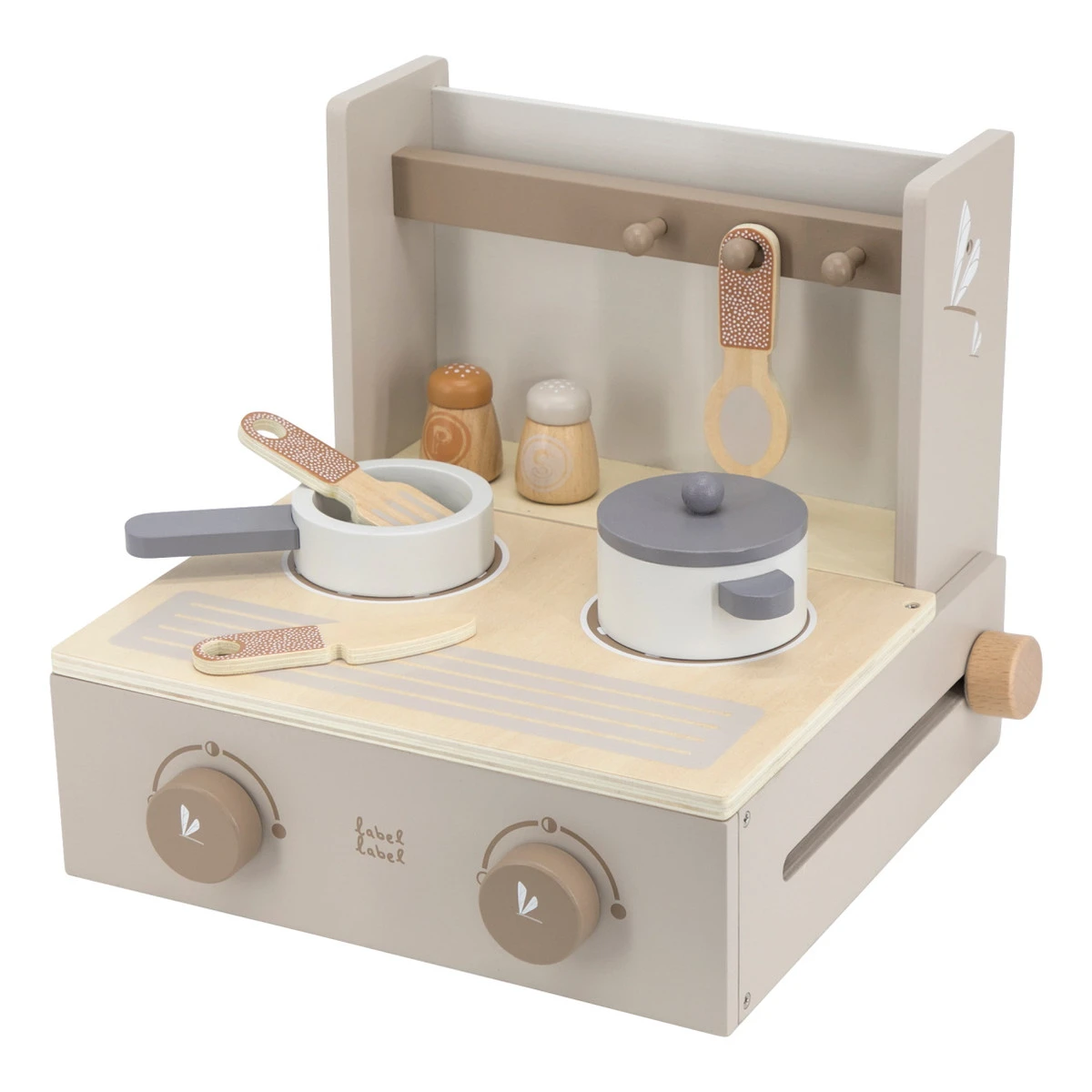 Je kleine zal zich een ware chef voelen als hij/zij aan het koken is op dit houten kookstel van Label Label! Deze compacte set heeft 2 kookpitten met draaiknoppen om ze in te stellen. Daarnaast is de set uitgerust met een steelpannetje, pannetje, peper- en zoutstel, een mes, spatel en een opscheplepel.