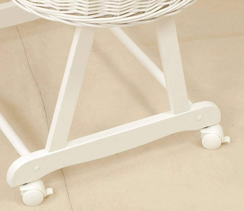 Schitterende luxe handgemaakte wieg op wieltjes. De rotan mand is netjes in de kleur wit afgewerkt en staat op een stevig onderstel. De babywieg wordt compleet uitgeleverd incl: binnenbekleding, sluier, matras en onderstel op wieltjes. De wieg is netjes afgewerkt met een romantische babystrik aan de bekleding. Het wiegje kan vastgezet worden met de rem op de wieltjes.