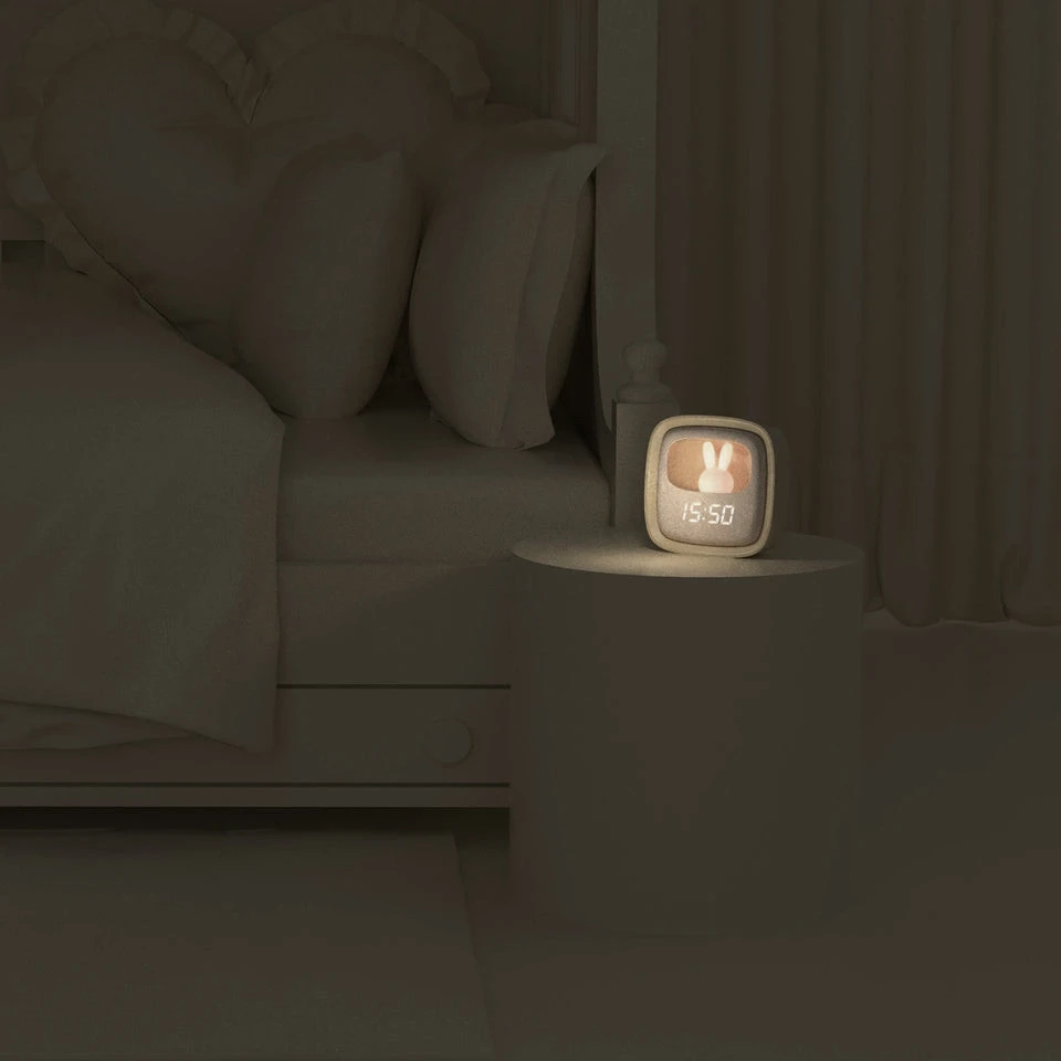 De wekker is tevens voorzien van een superschattig nachtlampje in de vorm van een lief, klein konijntje. De wekker is voorzien van een oplaadbare accu (micro USB, 5V) waarmee je tot 14 uur lang voorzien bent van de juiste tijd en een kalmerend lampje. Voldoende tijd dus voor de langste dutjes!