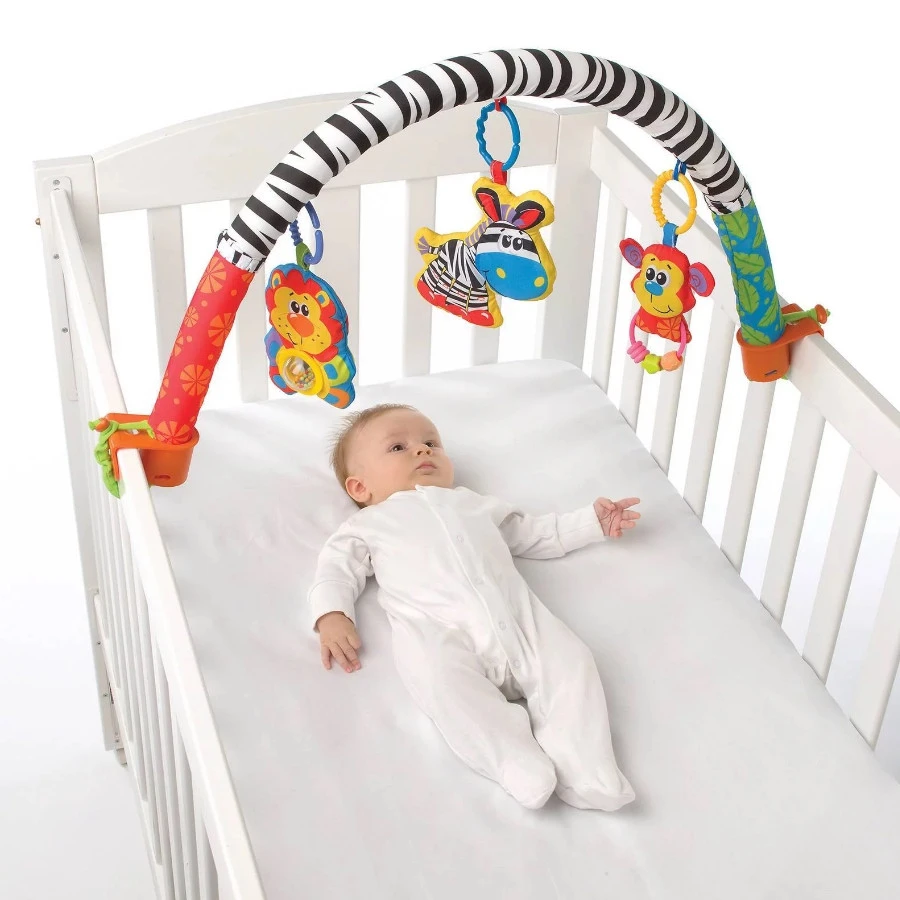 Ergens anders spelen dan op het kleed? Dat kan heel gemakkelijk! De speeltjes die aan de boog hangen kunnen eraf worden gehaald, zo kan je kleintje met de losse speeltjes spelen. De ringen waarmee de speeltjes bevestigd zijn dienen ook als bijtring. De boog van het speelkleed kan ook als zijspeeltje of mobiel boven de box worden gebruikt.Â
