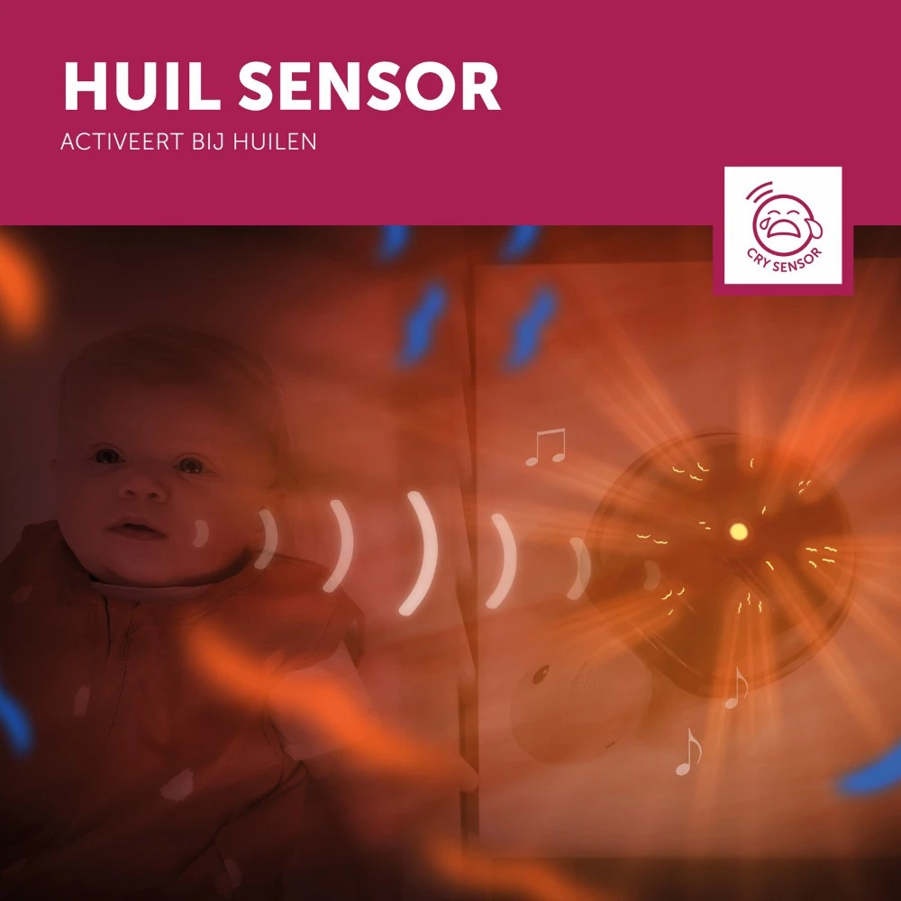 Je hebt de keuze uit drie soorten geluiden tijdens het in slaap vallen: Afrikaanse geluiden, hartslag of slaapliedjes (drie melodietjes). Ook kun je 2 volumeniveaus kiezen: hard of zacht. Begint je kindje te huilen? Tim de Schildpad heeft een huilsensor en zal dan automatisch aan gaan (optioneel). De projector werkt op 3-AA batterijen, deze zijn niet inbegrepen.