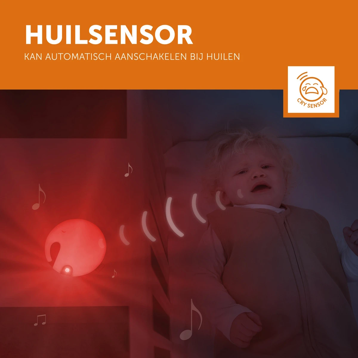 De lamp is uitgerust met een huilsensor waardoor deze automatisch in kan schakelen als je kindje zich niet op zijn of haar gemakt voelt. De lamp zal zichzelf uitschakelen aan de hand van de door jou gekozen instellingen (na 20 of 40 minuten, of constante modus). Als dat niet lekker slapen wordt..!