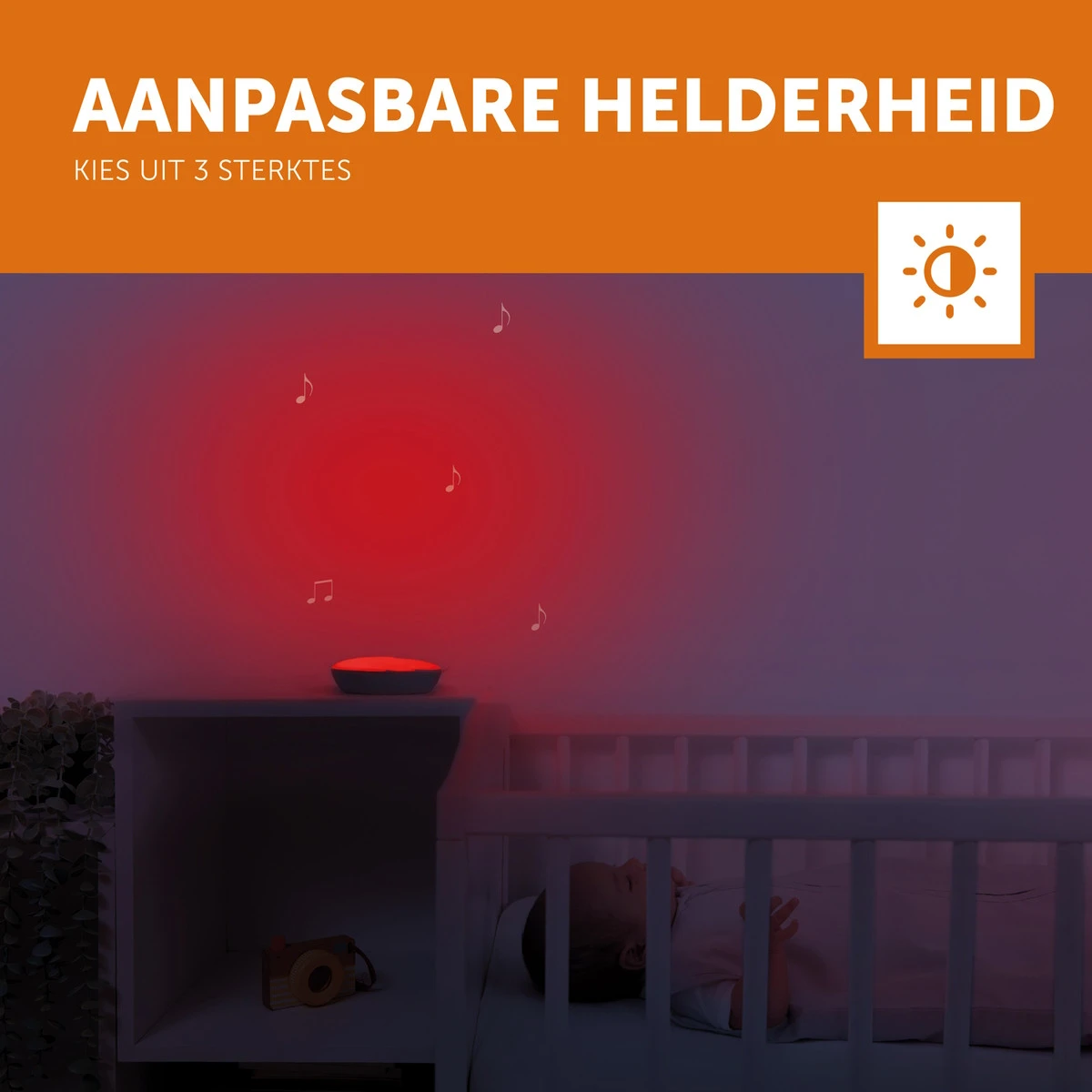- Keuze uit verschillende muziekjes: witte ruis, slaapliedjes, zonsondergang